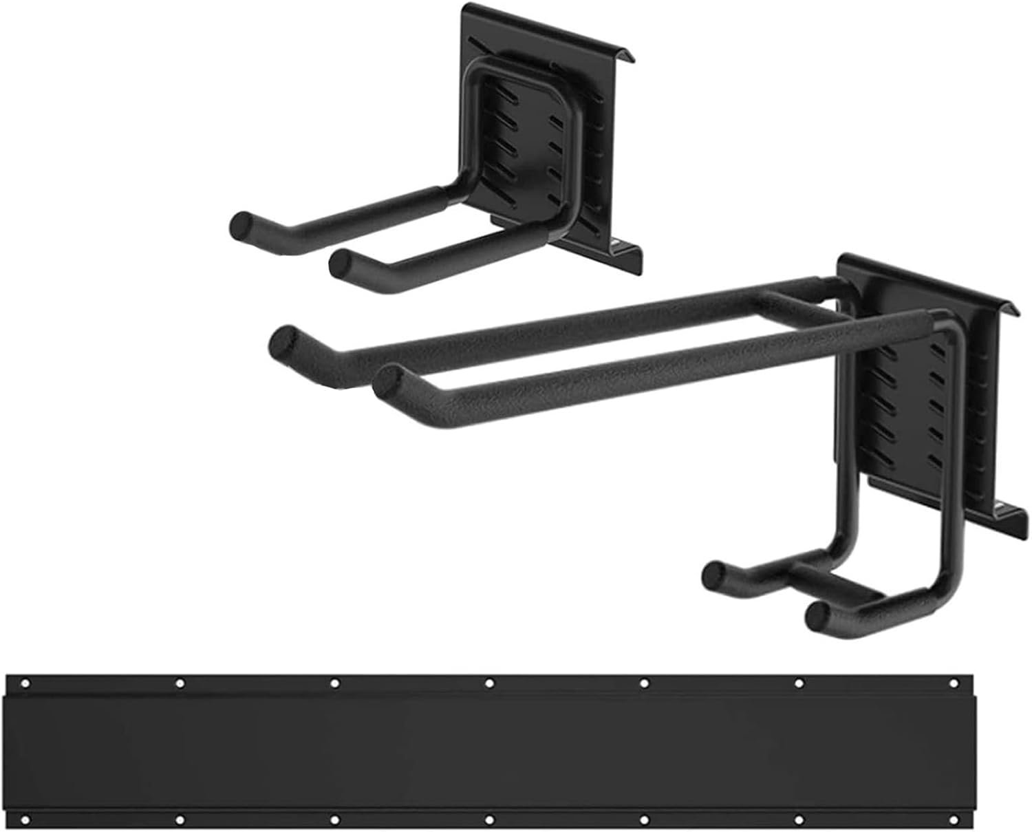 Combined with a diverse array of hooks (3 double hooks, 2 large double hooks, and 2 single hooks), you have a versatile command center that can hold a thin rake handle right next to a wide snowboard.