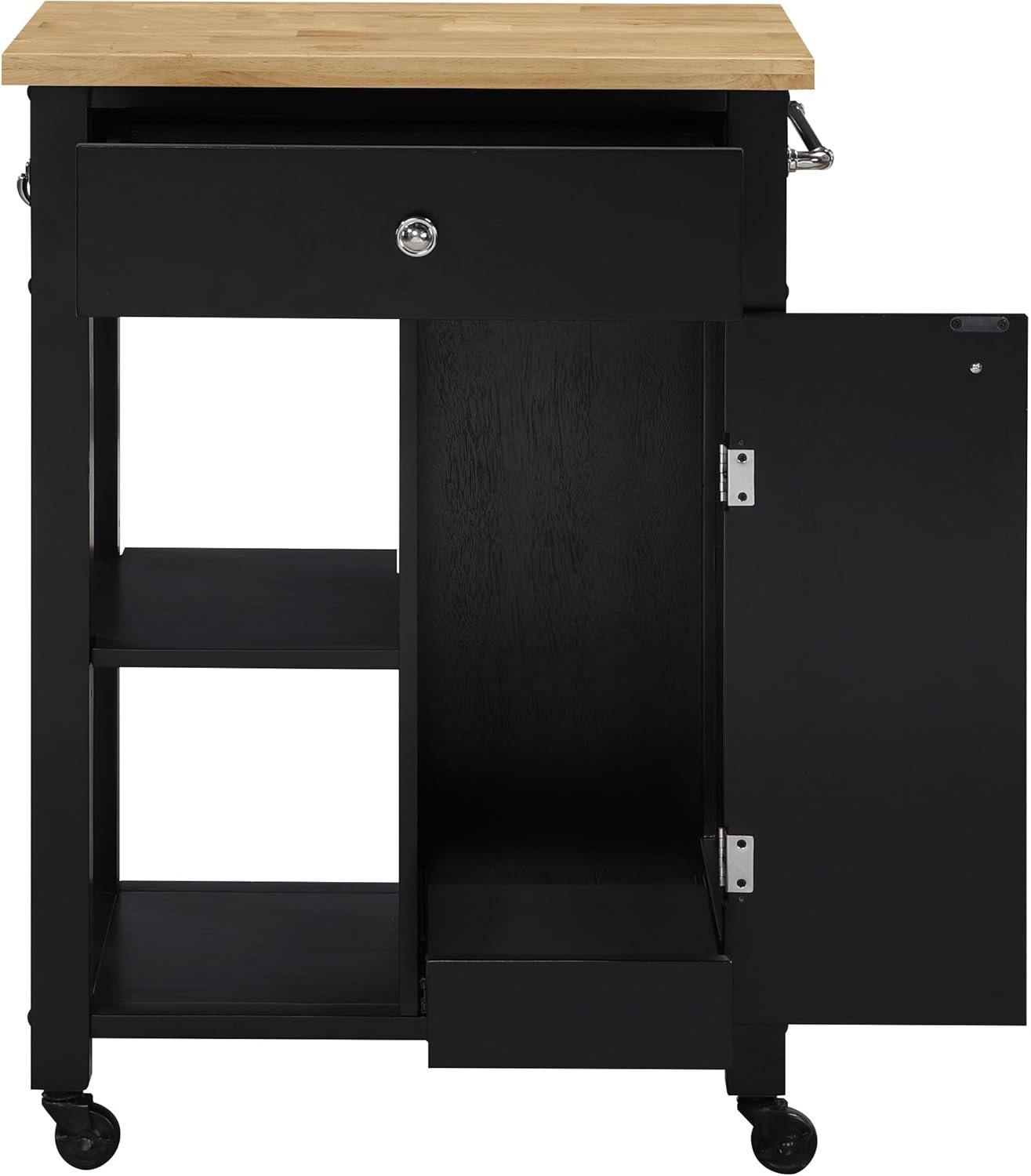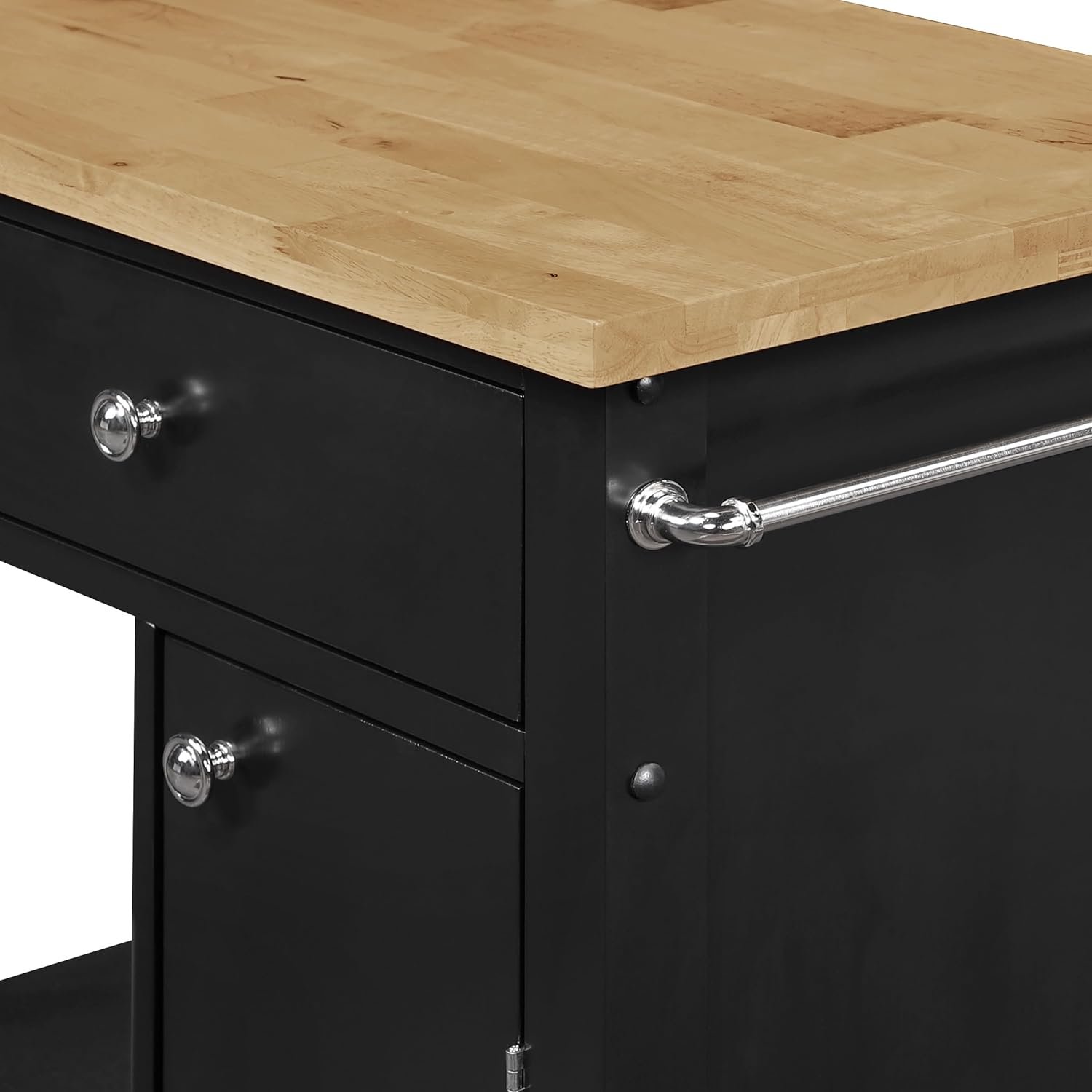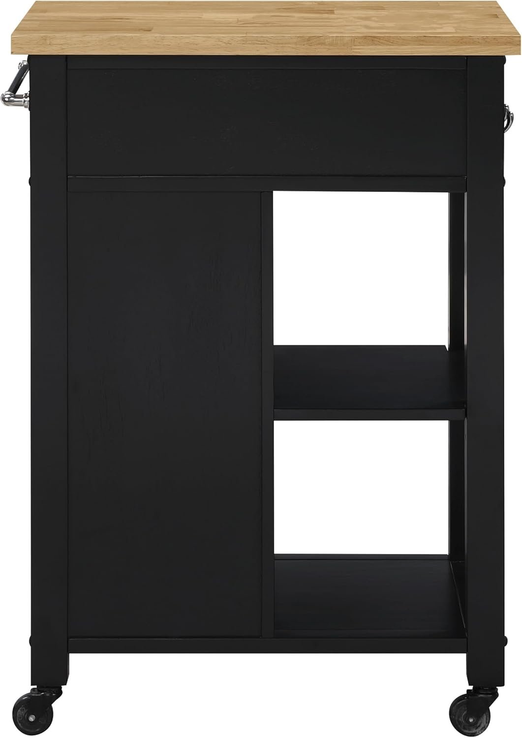 The black painted finish on the base is striking. It’s not a flat, cheap-looking plastic black; it has a depth to it that contrasts beautifully with the natural butcher block top. This high-contrast look is incredibly versatile. If you have white cabinets, this cart pops as a statement piece. If you have darker or wood cabinets, it blends in as a sophisticated accent.